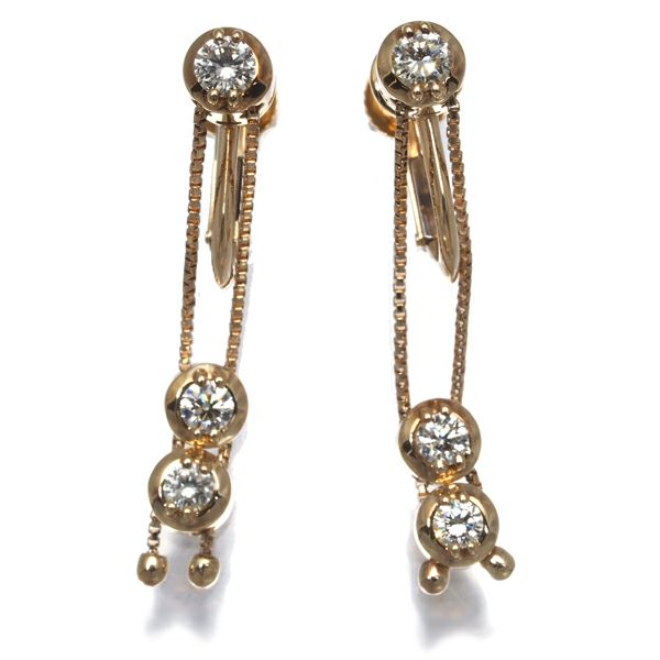 1石0.1ctアップのタサキ厳選ダイヤモンドを3石ずつ並べた美しいイヤリング。煌びやかな輝きを披露する上質ダイヤモンドはベネチアンチェーンの艶めきに並び、位置をご自由に移動出来る嬉しい機構も備えております。耳元エレガンス与えてくれるお品を是非どうぞ。