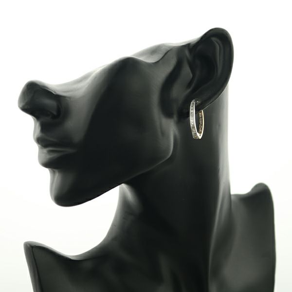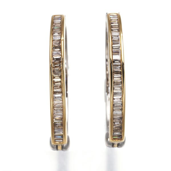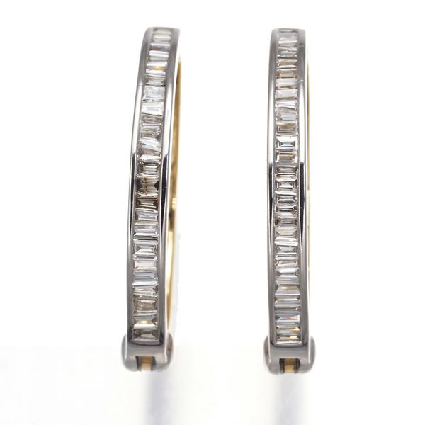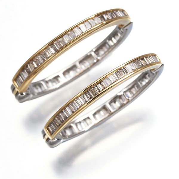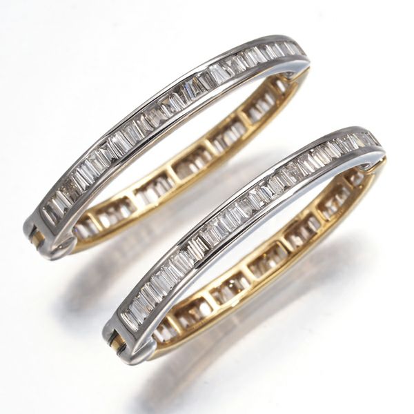 ゴールドとプラチナを使用したボリュームあるオーバルフープへGSTVセレクトの上質テーパーカットダイヤモンドを贅沢に敷き詰めたイヤリング。眩く煌びやかな表情が耳元にエレガンスを与えてくれます。