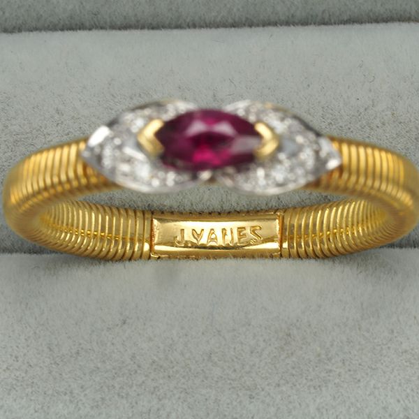 スペイン王室御用達ジュエラー ヤーネスの素敵な一品。厳選ダイヤの洗練された輝きに包まれ、繊細な輝きを魅せるルビーがお手元を美しく彩る上品なリングです。