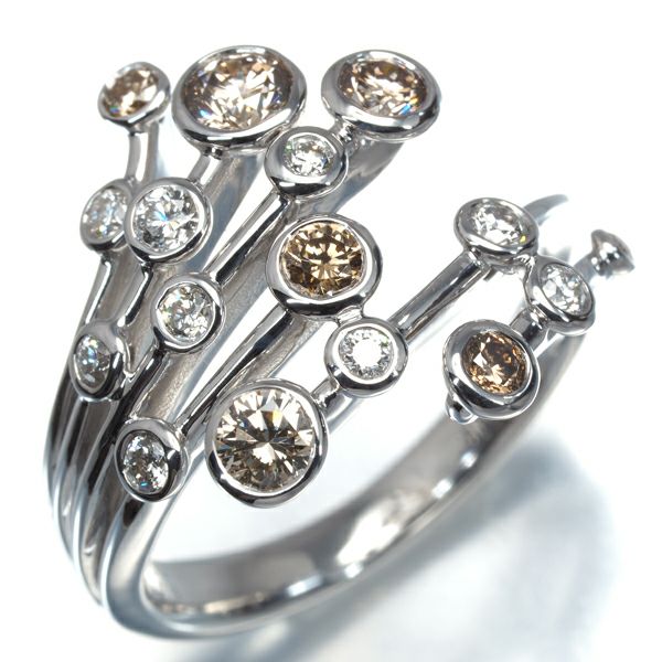 その名の通り、厳選したブラウン&クリアダイヤをベゼルセッティングしてリズミカルな輝きを演出した カシケイのベゼル ダイヤモンドリングです。