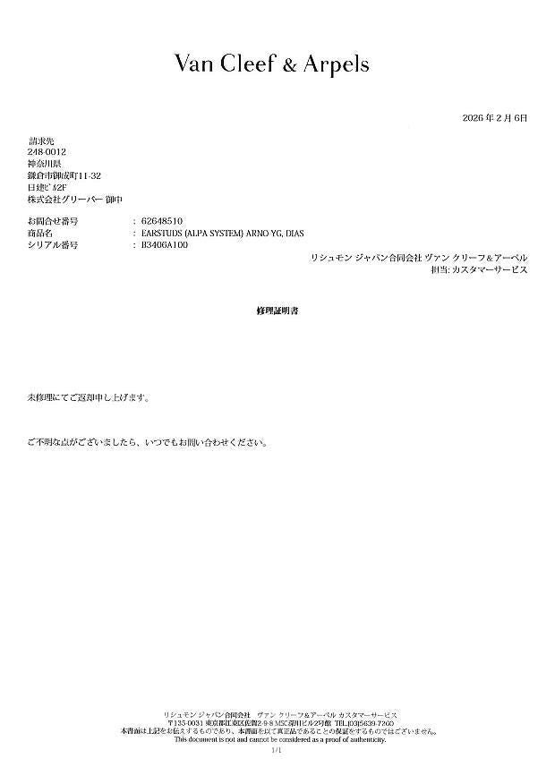 ヴァンクリーフ&アーペル ピアス ダイヤ ダイヤモンド アルノ K18YG 未修理証明書【中古】BLJ