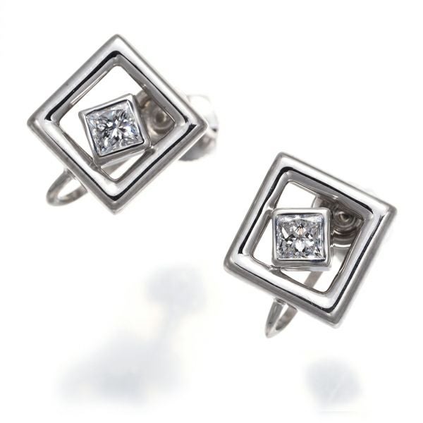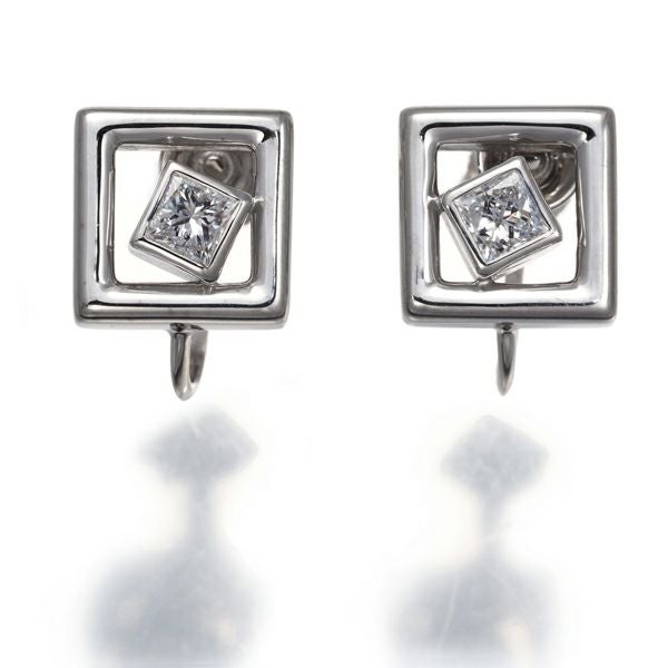 スクエアを重ねたジオメトリックなデザインに タサキ厳選ダイヤモンドの眩い輝きを飾ったスタイリッシュなイヤリング。装いの耳元を上品にえんしゅつしてくれます。