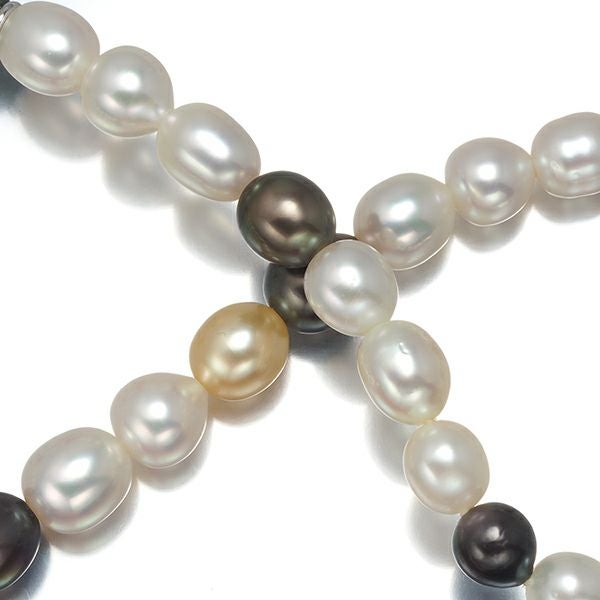 艶やかな光沢美しいミキモト厳選バロックパールの輝きを贅沢なスリーカラーで並べたネックレス。ホワイトをメインに、ゴールド、ブラックの気品溢れる彩が素晴らしいコントラストを演出してくれますよ。