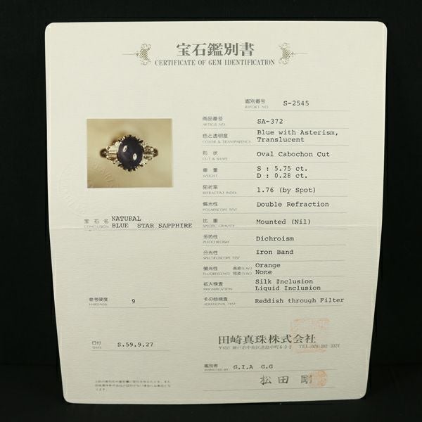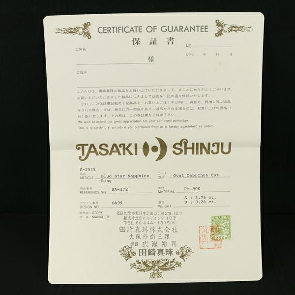 TASAKI タサキ リング スターサファイア 5.75ct ダイヤ ダイヤモンド 0.23c 11号 Pt900 鑑別書/保証書【中古】BLJ