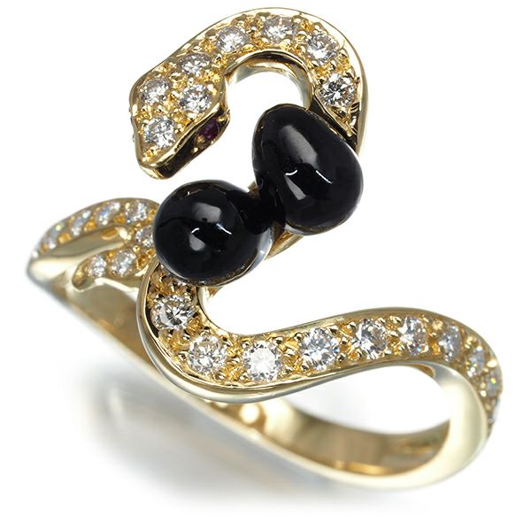 卓越した技術から芸術性豊かなジュエリーの数々を生み出す王室御用達ジュエラー カレライカレラの逸品。こちらは、上質ダイヤモンド輝くスネークモチーフへ艶やかなオニキスのアクセントを飾ったリングです。