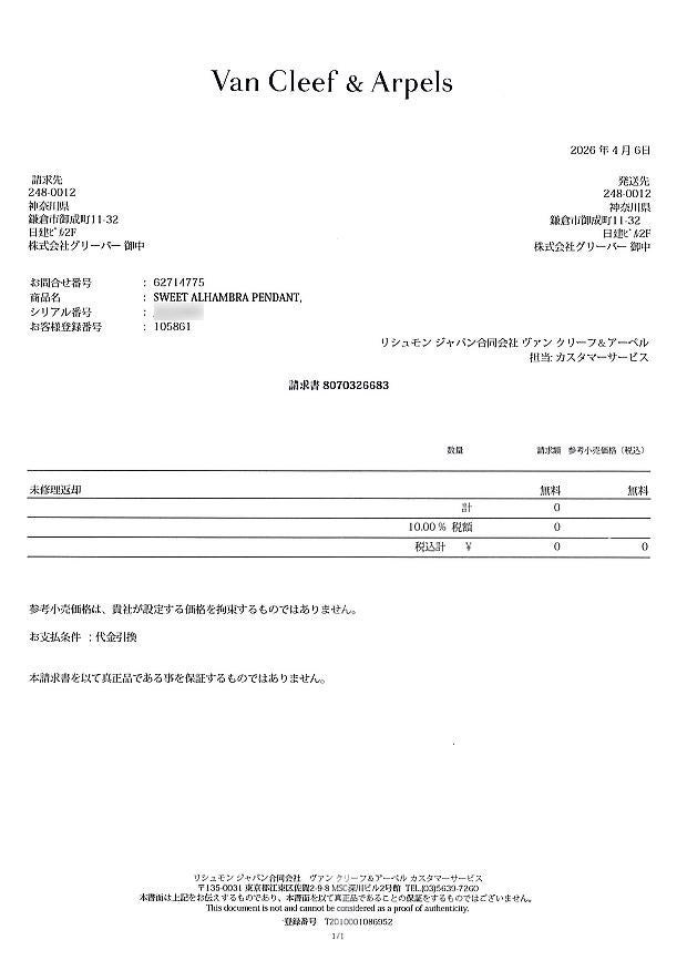 ヴァンクリーフ&アーペル ネックレス スウィートアルハンブラ K18PG 未修理証明書【中古】BLJ