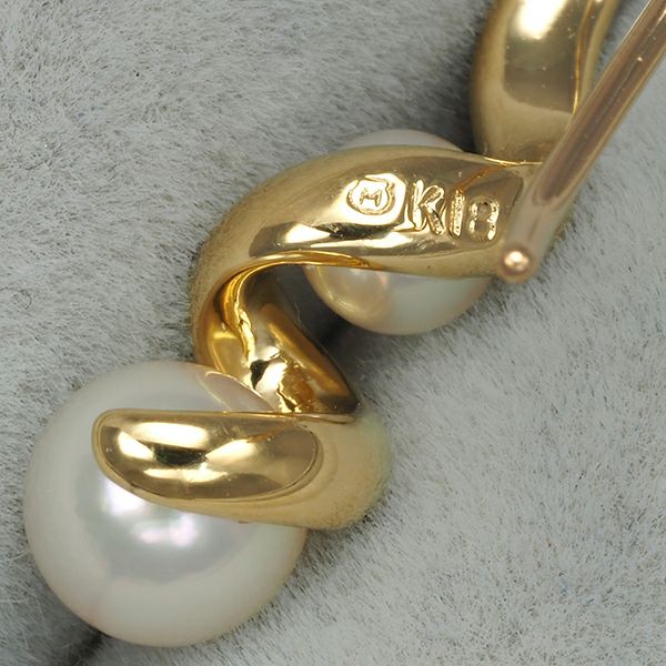 艶やかなゴールドのラインと2珠の上質アコヤ真珠が美しい輝きを演出するミキモトのピアスですよ。