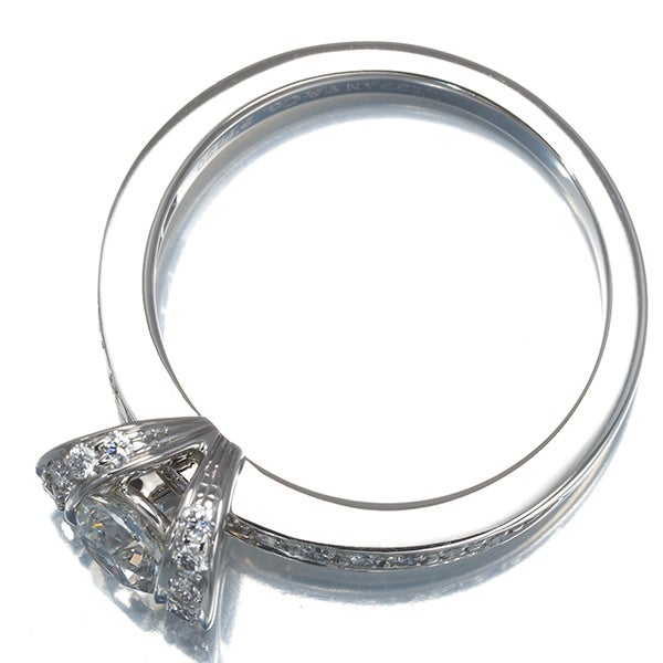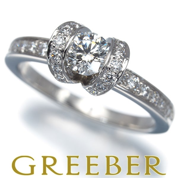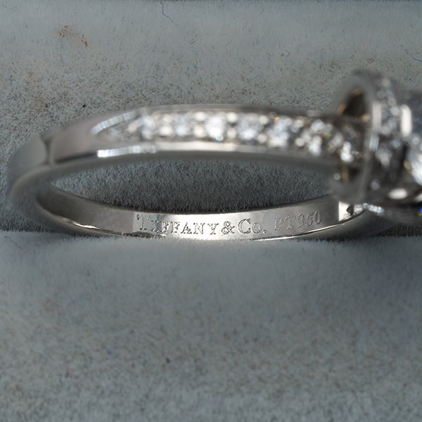 Hカラー、VVS2のクラリティと美しいプロポーションを持つ0.40ctものティファニー厳選ダイヤモンド。共に飾られた上質メレダイヤと共に優雅な煌めきを演出するリボンリングです。