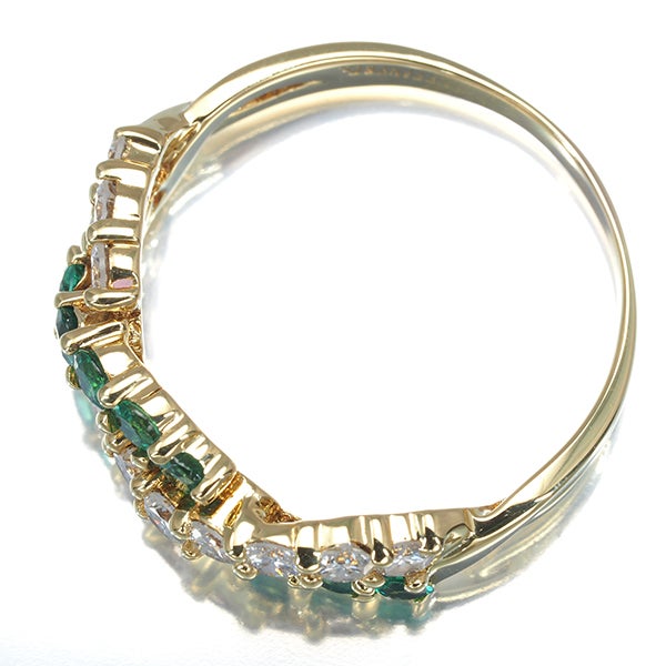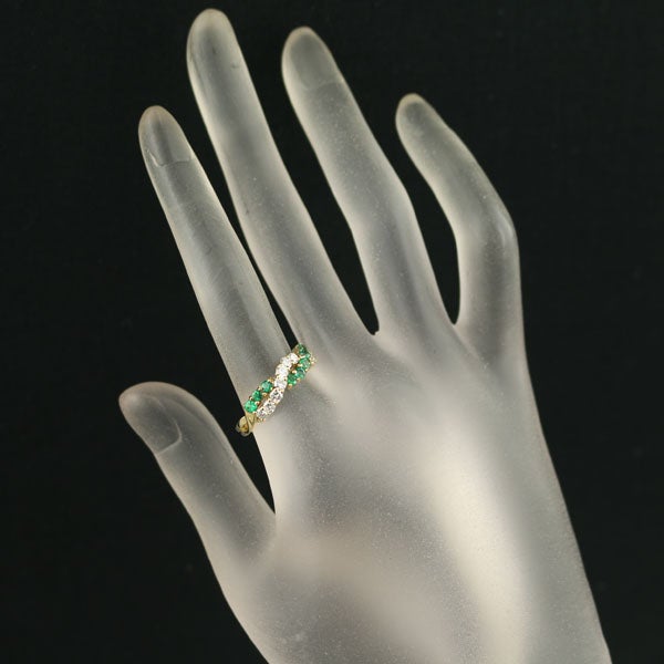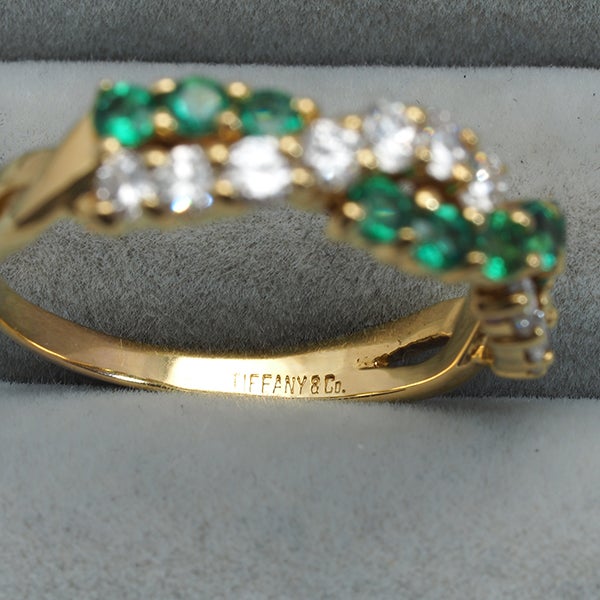 立体交差するようなラインを描きながらティファニー厳選ダイヤモンドとエメラルドが素晴らしい輝きを披露するゴールドリングです。