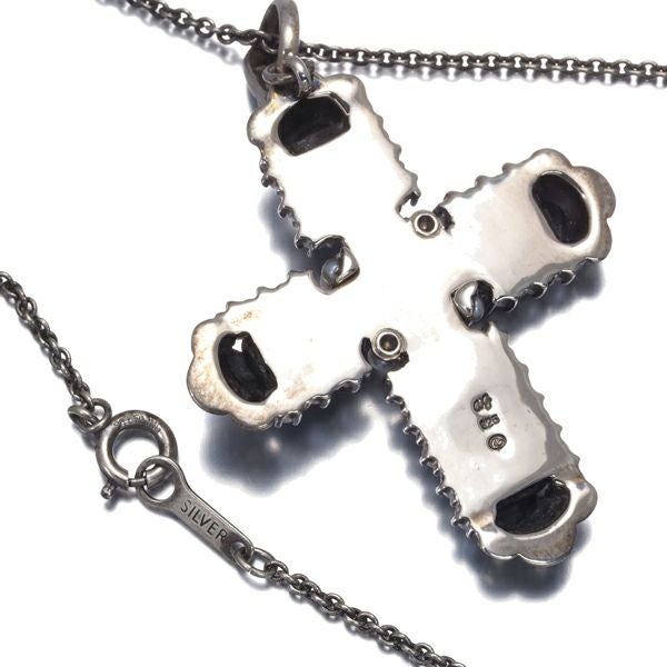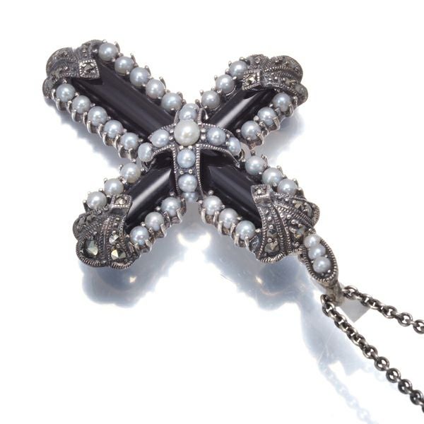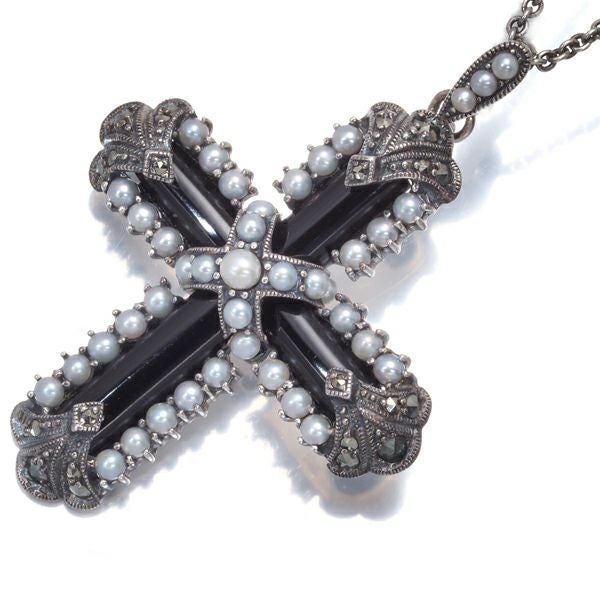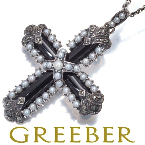 碌山 ロクザン ネックレス シードパール 真珠 2.0-2.5mm オニキス マーカサイト クロス シルバー 925 【中古】BLJ/GENJ