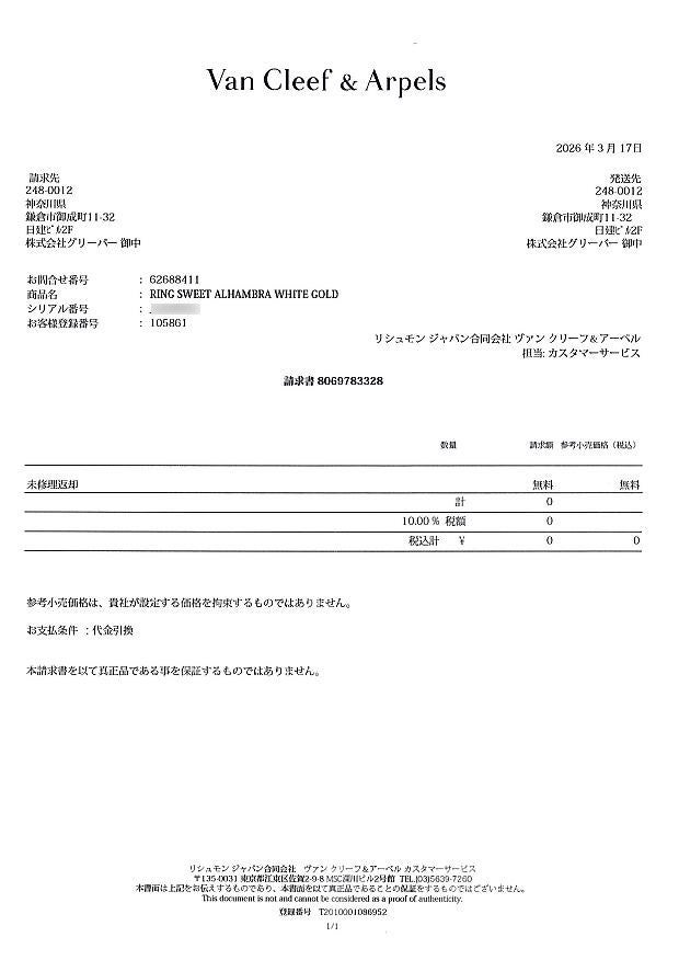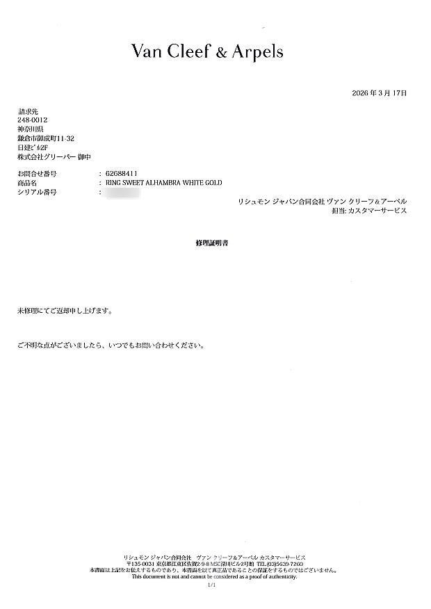 ヴァンクリーフ&アーペル リング ダイヤ ダイヤモンド スウィートアルハンブラ 53号 K18WG 未修理証明書【中古】BLJ