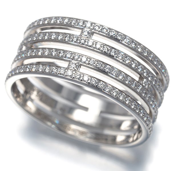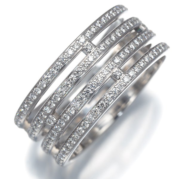 ギリシャ神話に由来する洗練されたフォルムと艶やかな光沢、上品に飾られた厳選ダイヤの煌めきがお手元を包み込む エルメスのアリアンヌ ウェディング ダイヤモンドリングです。