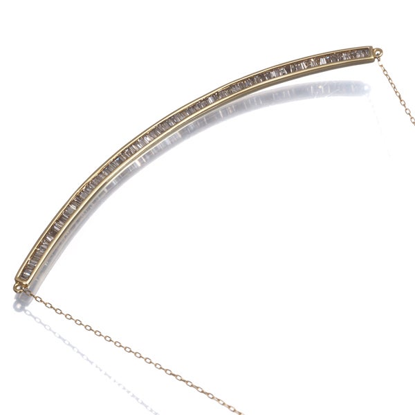 大振りのカーブラインに仄かなお色味を纏ったテーパーカットダイヤモンドのシャープな煌めきを飾った GSTVのネックレス。総計1ctものボリュームとともに 装いの胸元に贅沢に煌めく贅沢な一品ですよ。