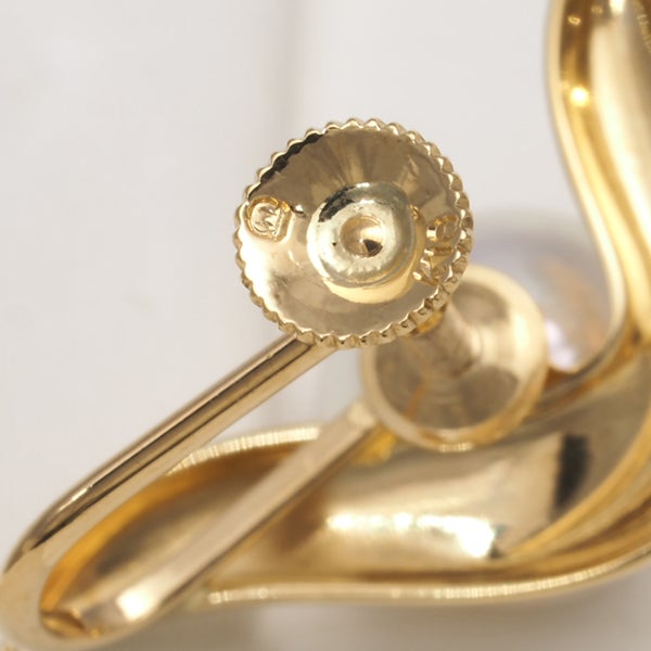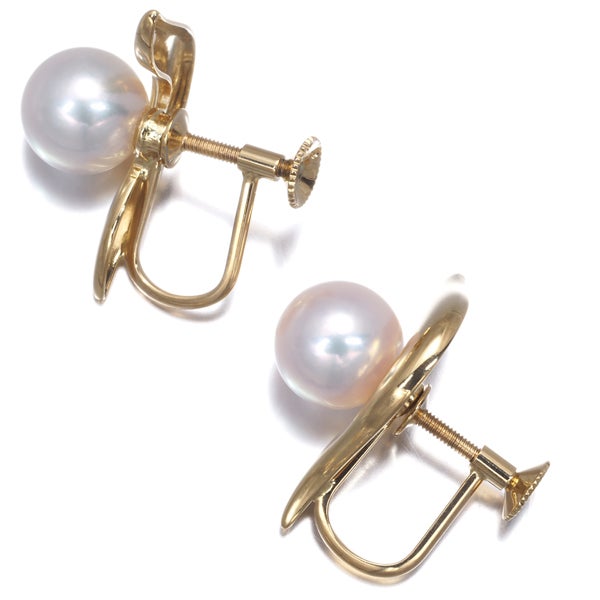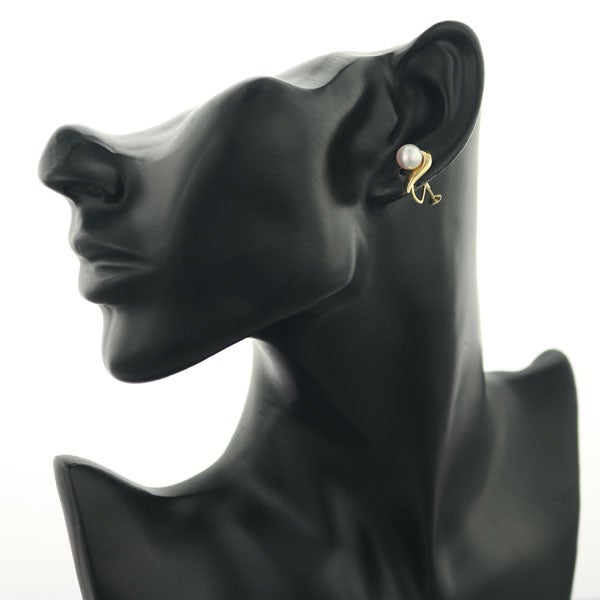 イエローゴールドの艶やかな光沢で描いた優美なフォルムにピンクの干渉色を纏ったホワイト系のお色味から僅かなエクボも耳元では感じさせない輝きを放つ ミキモトのアコヤ真珠を飾った美しいイヤリングです。