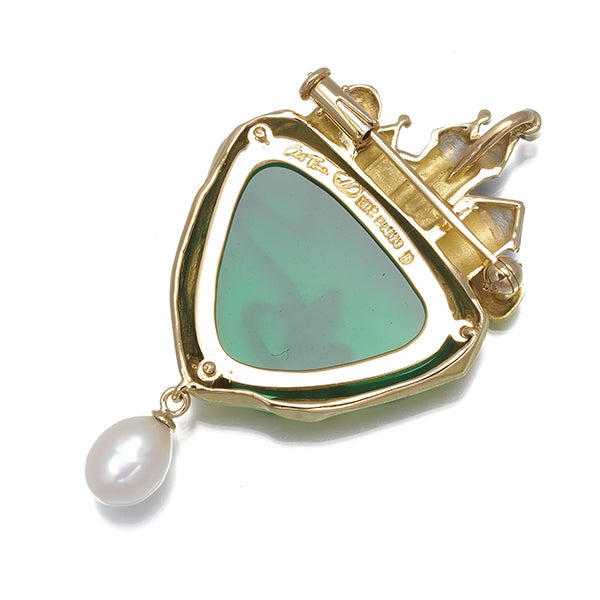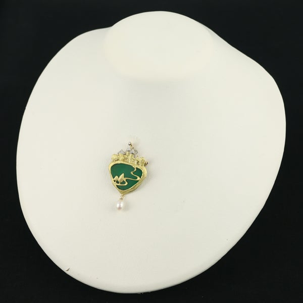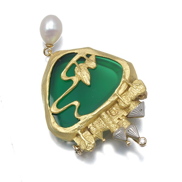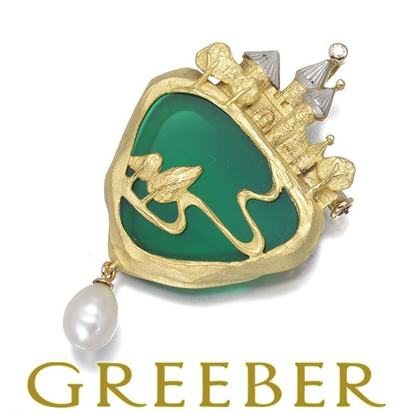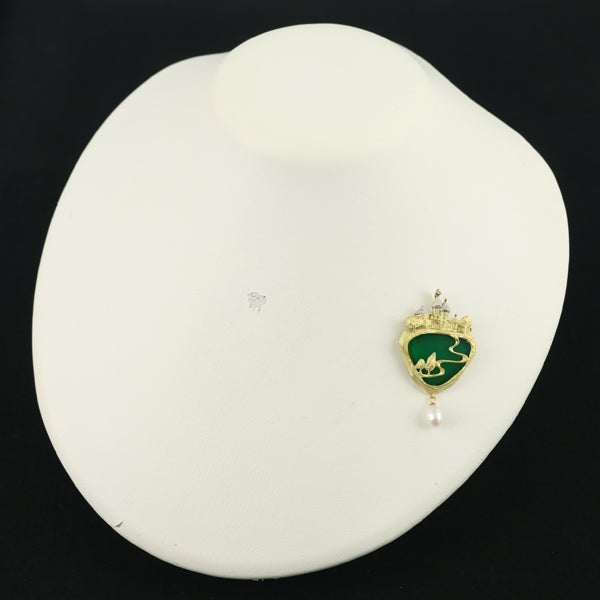 ジュエリーデザイナー石川暢子さんのAstimeコレクションより、ブローチ兼ペンダントトップとして 様々な装いにお楽しみいただける2WAYジュエリーを。イエローゴールドとプラチナを贅沢に使用して描かれた古城の優雅な情景が グリーンメノウの艶やかな輝きに美しく映える逸品。艶やかに揺れるパールの輝きとともに 胸元をエレガントに演出してくれます。
