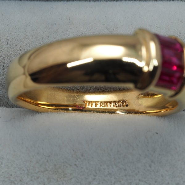 シンプルなリングアームとルビーの煌きが美しいコントラストを奏でる、ティファニーのスタッキングリングです。