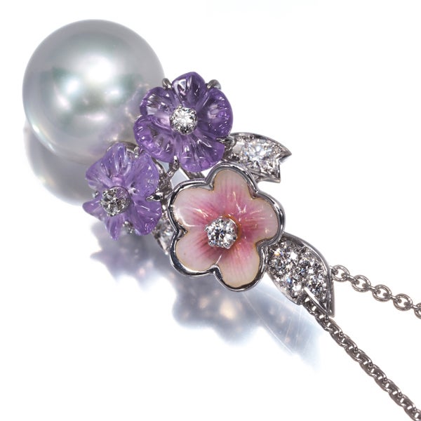 上質なテリ煌めきを披露する白蝶真珠の優雅な印象とエナメルの美しい色合い、厳選ダイヤモンドの輝きが胸元にエレガンスを与えてくれるミキモトの高級ネックレスですよ。