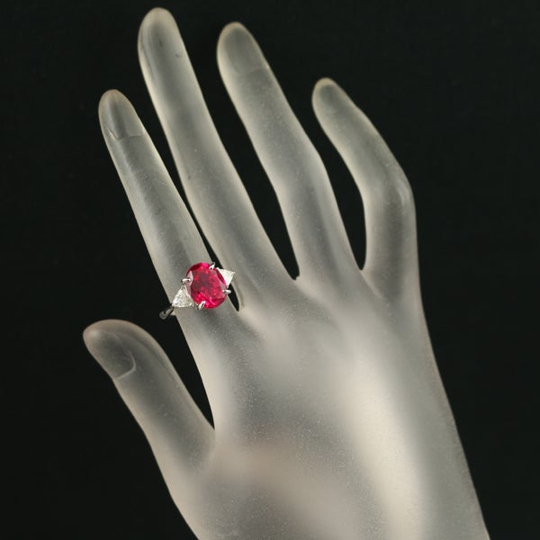 鮮やかな赤の光彩を披露するクレサンベールの再結晶ルビー。美しいテリをも披露する極上の1石は4.62ctもの素晴らしいボリュームでお手元を演出します。両脇に添えられた上質トリリアントカットのダイヤモンドと共にラグジュアリーなオーラを魅せてくれる逸品ですね。