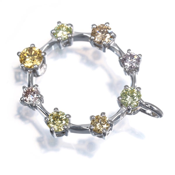 イエロー、グリーニッシュイエロー、オレンジ、希少なピンクと 豊かな彩りから眩いばかりの光彩を放つ厳選ダイヤモンドの輝きをリースのように飾った素敵なジュエリー。名執左結里さんらしいエレガントなニュアンスとともに 胸元を贅沢に輝かせてくれる美しい逸品ですよ。