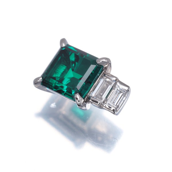 膨大な手間と時間を掛けて生み出された理想的な色合いと輝きが実に見事な クレサンベールの再結晶エメラルドを飾ったペンダントトップ。奥からも湧き上がる爛々と輝きを 上質バゲットカットダイヤの美しい煌めきがいっそう引き立てていますね。