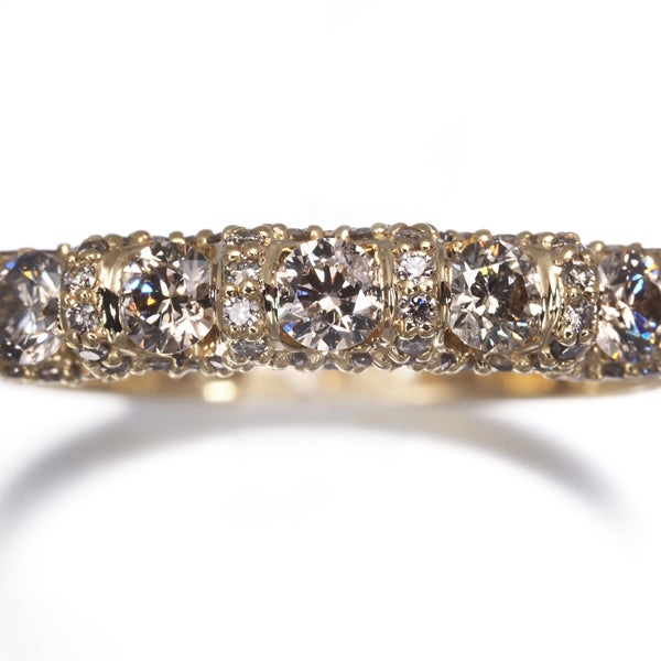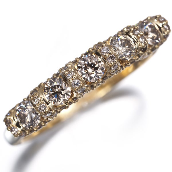 ブラウンダイヤならではのシックなニュアンスから透明感溢れる眩い輝きを放つ5石が虹色の光彩とともにお手元を演出する GSTVのダイヤモンドリング。多少の内包物もお手元では感じさせない煌びやかな輝き。エレガントなデザインにはメレダイヤの煌めきも添えられた素敵な一品ですよ。
