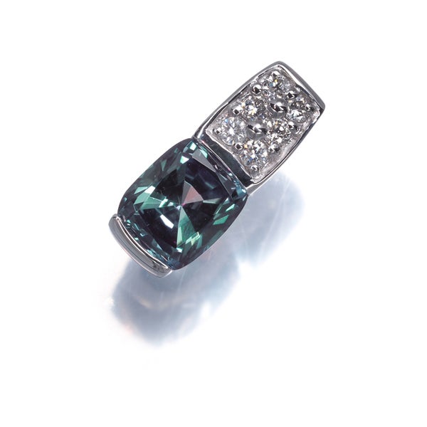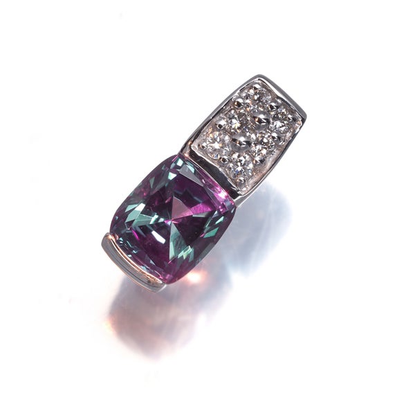 膨大な手間と時間を掛けて生み出された理想的な色合いと輝きが見事なムーンジュエリーの再結晶アレキサンドライトの魅力を飾ったペンダントトップ。妖艶ささえ感じさせる美しい彩りを 上質ダイヤモンドの煌めきが引き立てた上品な一品を胸元にお楽しみください。