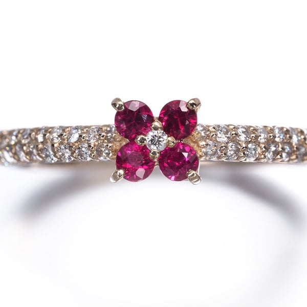 ピンキッシュレッドの美しい彩りに輝くルビーの花に上質メレダイヤの瑞々しい煌めきを飾った ポンテヴェキオの素敵なフラワージュエリー。装いを可憐に彩る素敵な一品を どうぞお手元にお楽しみください。