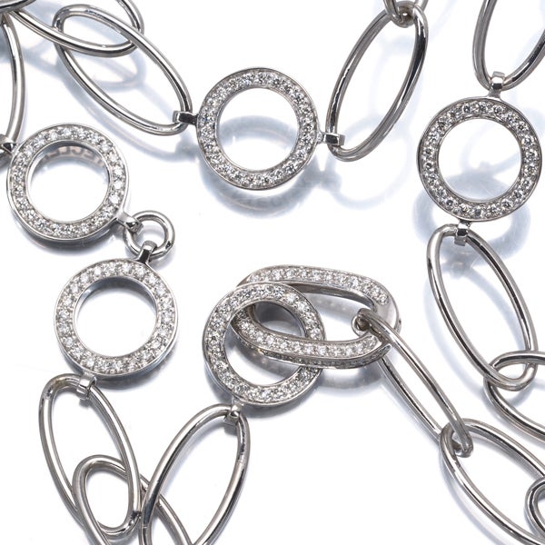 オーバルリンクの艶やかな存在感に厳選されたダイヤモンドの瑞々しさが輝きを放つ シャンテクレールの美しいネックレス。アシンメトリーなデザインとお好みの長さでスタイルアレンジメントをお楽しみいただける魅力的な逸品ジュエリーですよ。