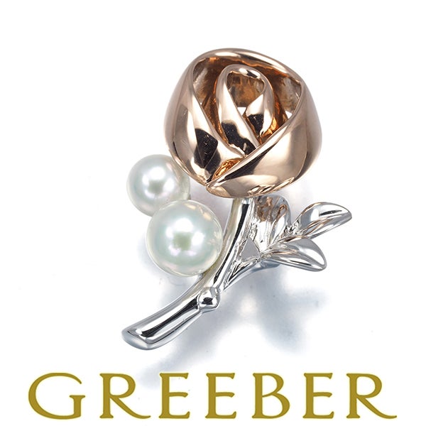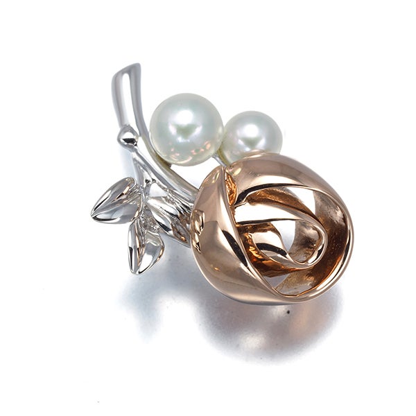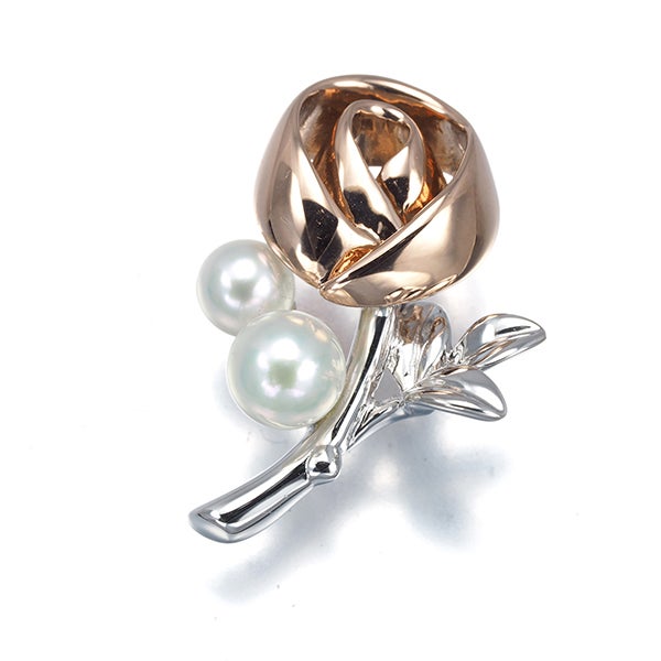 ピンクゴールドの光沢でバラの柔らかな花びらを描いた ミキモトの素敵なブローチ。花露のように飾られた厳選アコヤ真珠が上品な輝きを添えていますね。