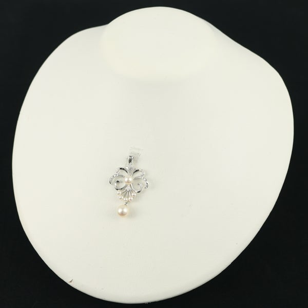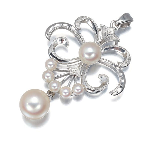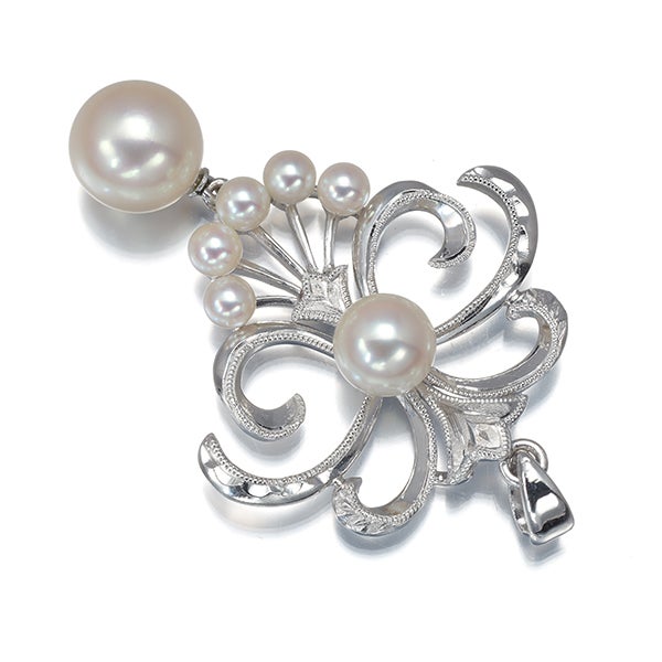 細やかな彫金細工で描かれた美しいモチーフに ミキモト厳選アコヤ真珠の上品な艶めきが揺れる素敵なペンダントトップ。エクボ等も見られない美しい輝きを 装いの胸元にお楽しみください。