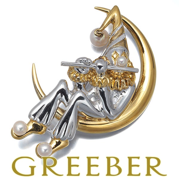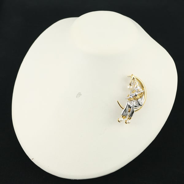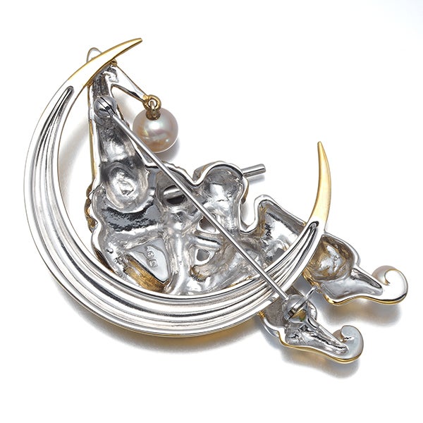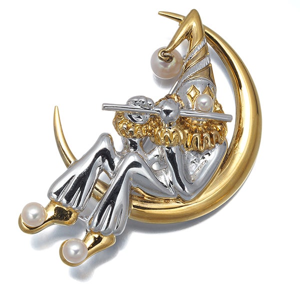 パールホワイトの珠肌に浮かぶ深い干渉色が美しいミキモト厳選アコヤ真珠は、目立つエクボや巻きムラも見られない上質なテリ艶が美しい輝き。実に繊細かつ立体的な作りで描かれたピエロが 月の上で優雅に奏でる印象的な作品です。遊び心溢れるデザインとともに 艶やかに揺れる真珠の美しさをお楽しみいただける ミキモトならではのブローチですよ。