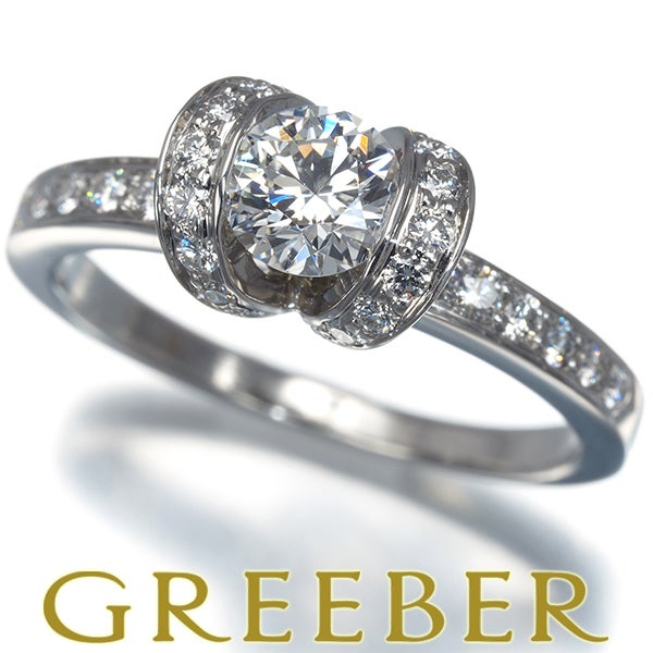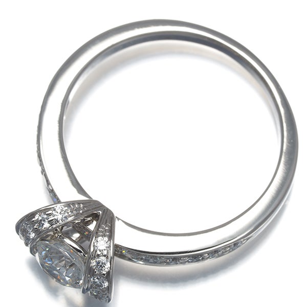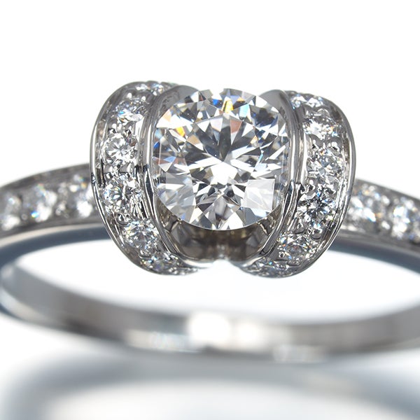Fカラー、VVS2のクラリティと美しいプロポーションを持つ0.50ctものティファニー厳選ダイヤモンド。共に飾られた上質メレダイヤと共に優雅な煌めきを演出するリボンリングです。