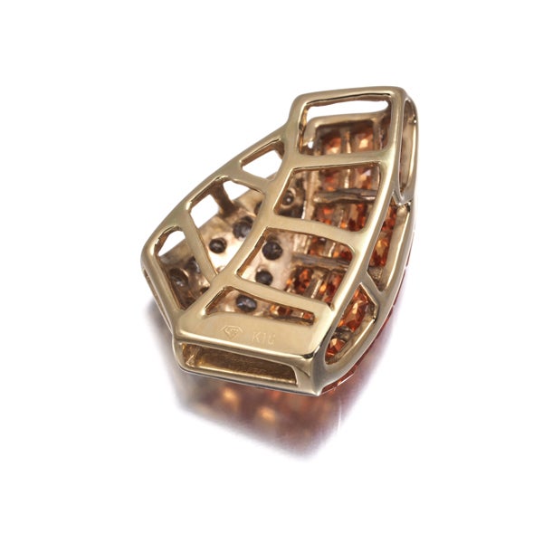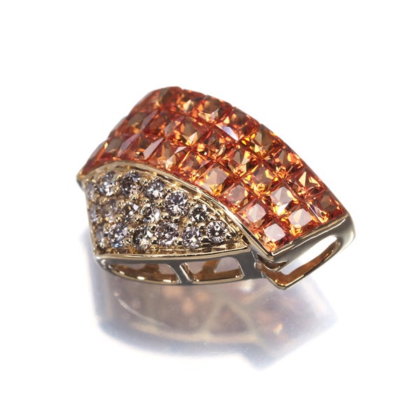 宝石の輝きを遮ることのなく最大限に美しさを引き出すミステリーセッティングで描かれた レ・エッセンシャルのペンダントトップです。オレンジサファイアの鮮やかに映える煌めきが胸元を演出しますよ。