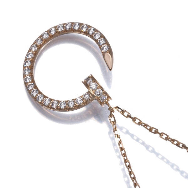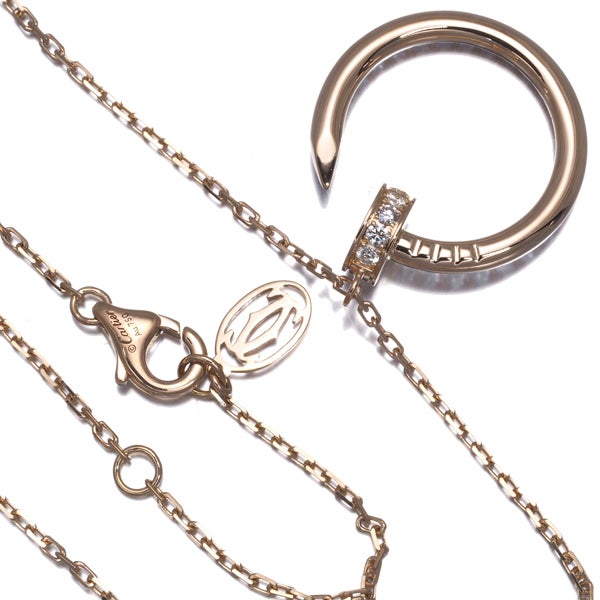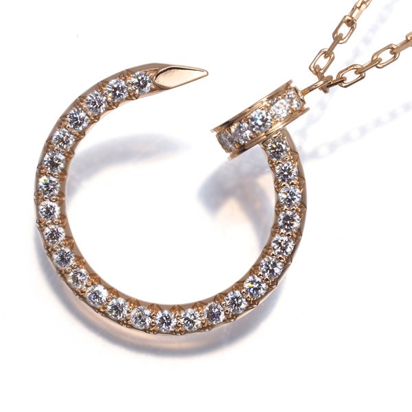 1本の釘をモチーフとした大胆かつモダンなデザインが厳選ダイヤと共に輝く カルティエのジュストアンクル ダイヤモンドネックレスです。