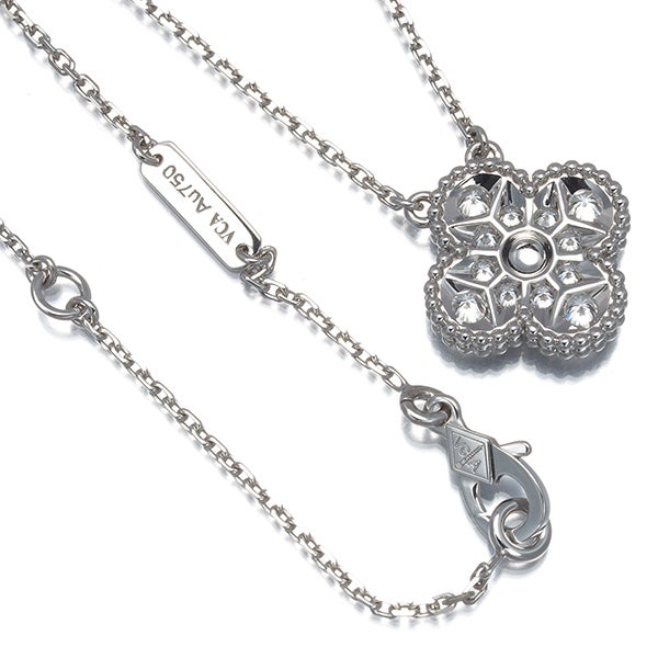 メゾンを象徴する優雅なアルハンブラコレクション。繊細なビーズ枠と共に極上ダイヤが輝く逸品ダイヤモンドネックレスです。