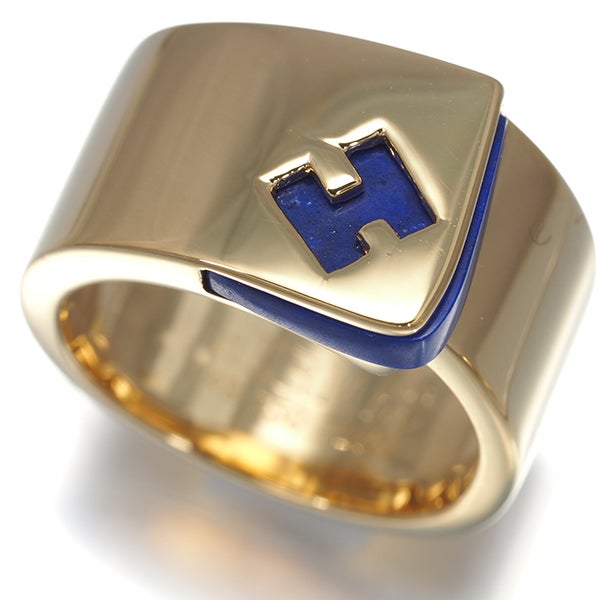 一枚のプレートを重ねるように演出したエルメスのリング。くり抜かれたHの文字と共に ラピスラズリのブルーのアクセントを飾った素敵なお品です。