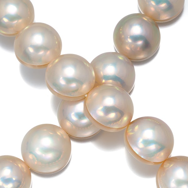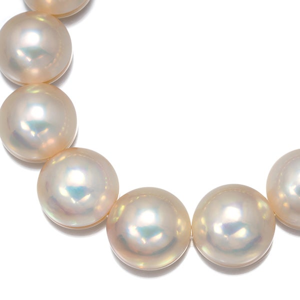 虹色の干渉色と共に極上のテリ艶を披露するタサキ厳選マベパールの輝きを連ねた高級ネックレス。胸元に気品の煌めきを与えてくれるお品です。