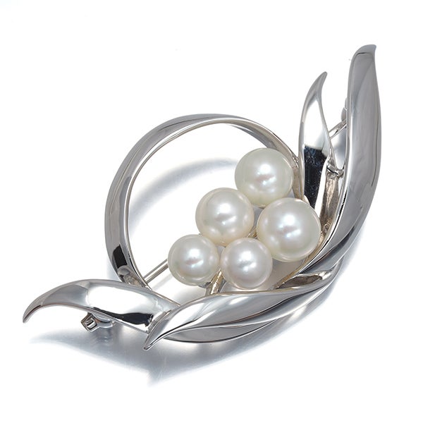 パールホワイトの神秘的な輝きをリーフを思わせる美しいフォルムに飾った ミキモト厳選アコヤ真珠のブローチ。エレガントなニュアンスとともに 装いを上品に演出してくれます。
