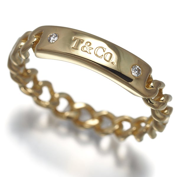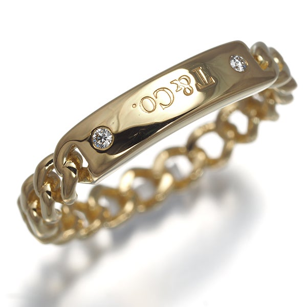 キヘイチェーンを模ったアームに ティファニーのロゴをデザインした印象的な一品。厳選ダイヤの煌めきがさり気なく飾られていますよ。