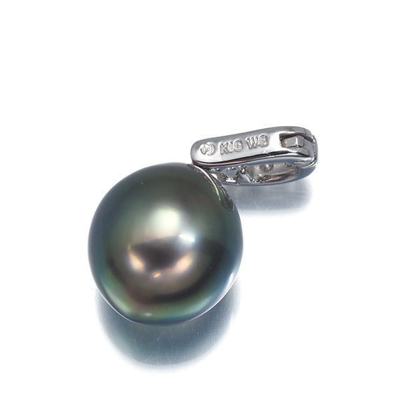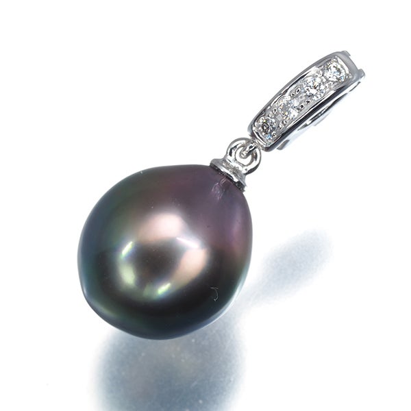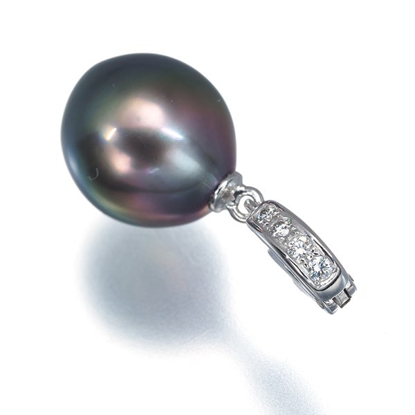 ピンクの干渉色を纏った華やかなお色味と美しいテリ艶が目を引く タサキ厳選黒蝶真珠のペンダントトップ。上質メレダイヤの煌めきが その美しさをいっそう引き立てていますね。