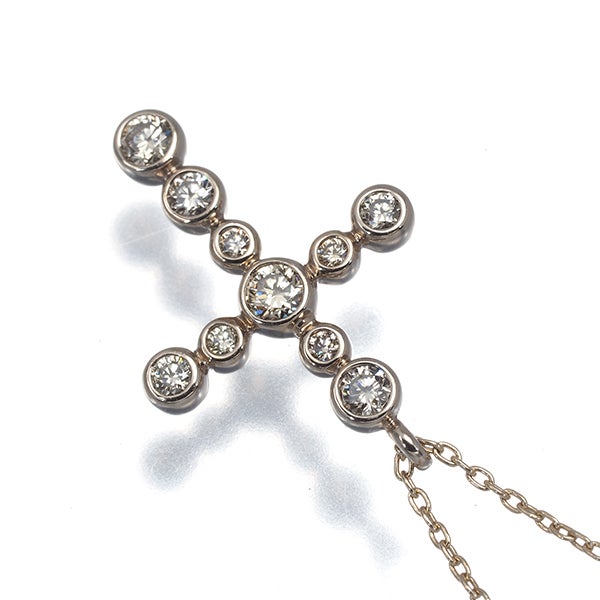 その名の通り、厳選したブラウンダイヤの輝きをベゼルセッティングのクロスモチーフに飾った カシケイのベゼル ダイヤモンドネックレスです。
