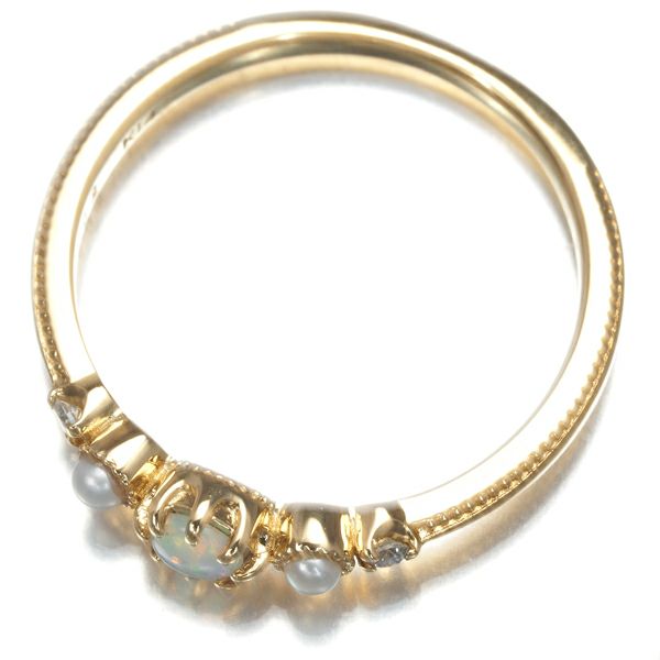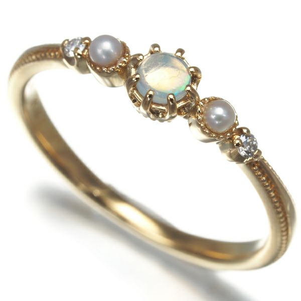 遊色の美しい煌めき魅せるオパールと共に艶やかな真珠とメレダイヤの輝きを飾ったアガットのリングです。