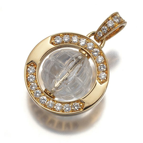 地球を思わせるような細やかなカーヴィングが施されたクォーツが透明感溢れる輝きを魅せながら回転する ブシュロンの遊び心が感じられる2000年限定のペンダントトップ。周囲に飾られた極上厳選ダイヤが洗練された美しさを醸し出しています。