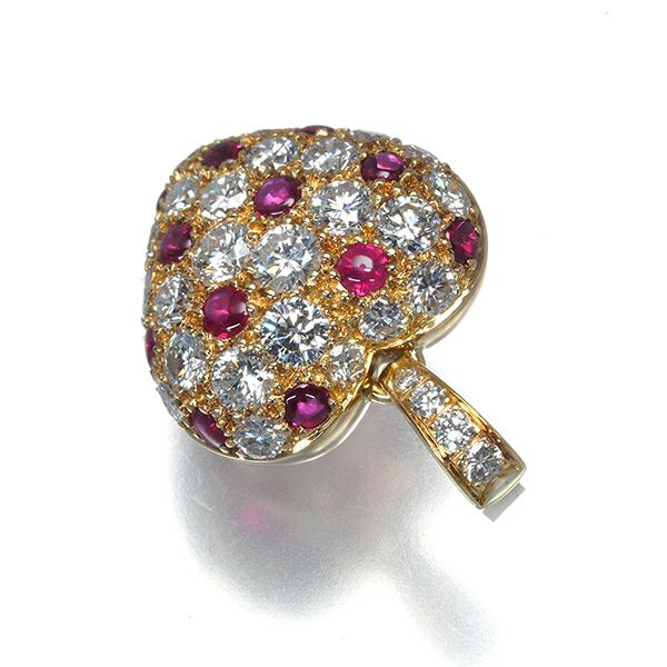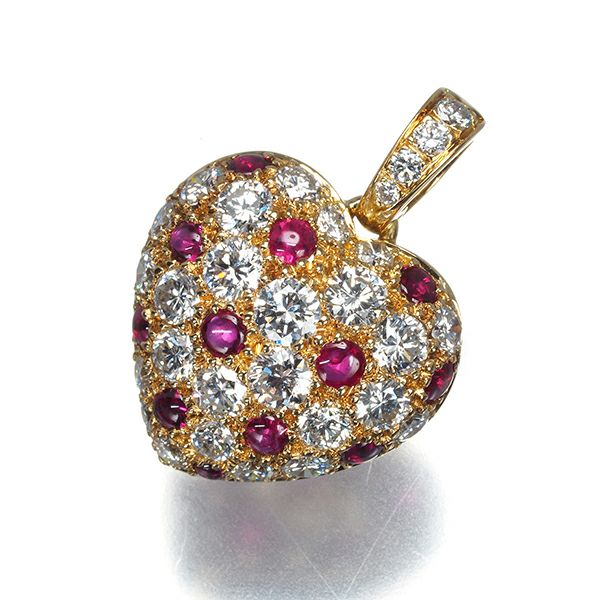 ふっくらとしたおおぶりのハートに色美しく艶やかなカボションカットのルビーと厳選された極上ダイヤモンドの素晴らしい輝きが見事なコントラストを織りなし 装いの胸元を優雅に飾る カルティエならではの美しいペンダントトップです。