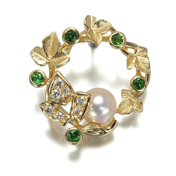 ミキモト ブローチ パール 真珠 6.2mm グリーンガーネット リーフ ピン K18YG 【中古】BLJ 大幅値下げ品