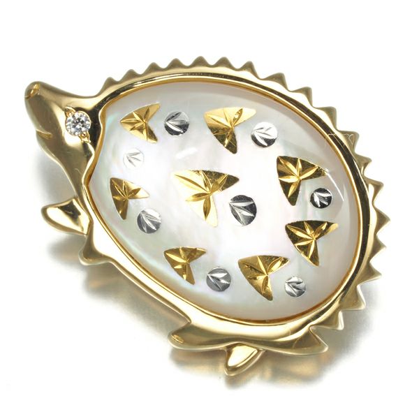 伝統的な技法 ピクウェ を現代に蘇らせた ミキモトの美しい一品。中央で美しい煌めき放つシェルと共に可愛らしいハリネズミデザインを演出したブローチです。