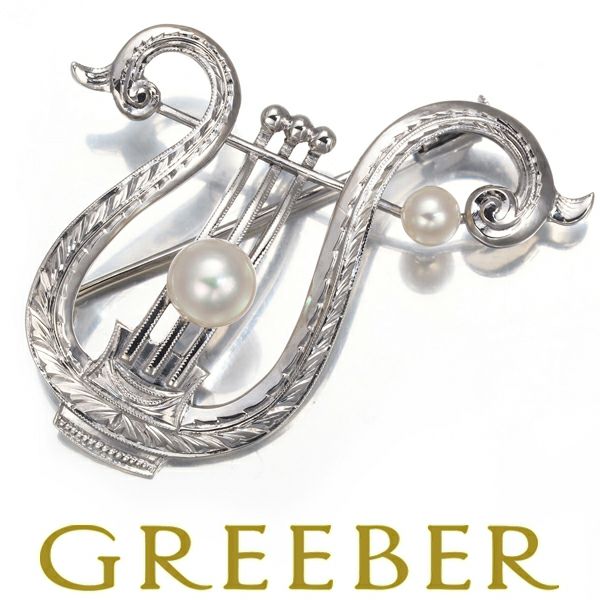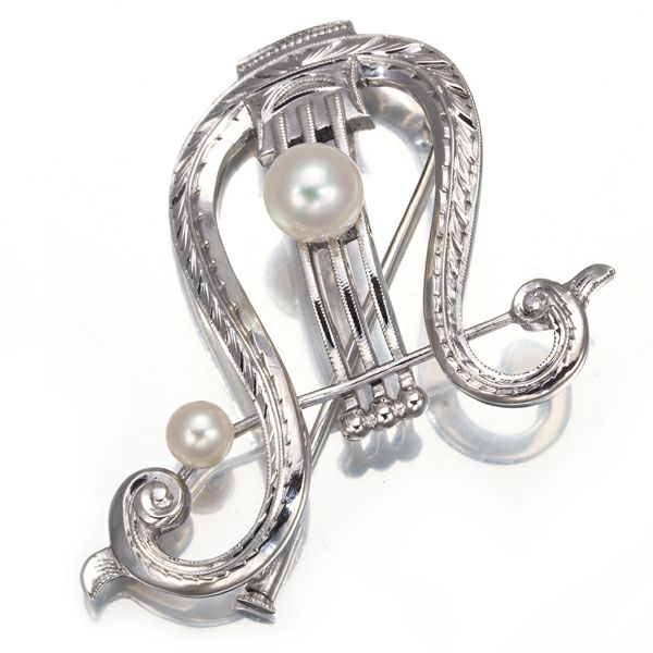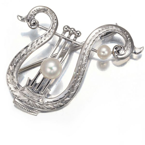 繊細な彫金で仕立てられた美しい竪琴のデザインへ上質アコヤ真珠の輝きを添えたミキモトのブローチジュエリーです。オールドな商品でクラシカルなデザインが素敵です。