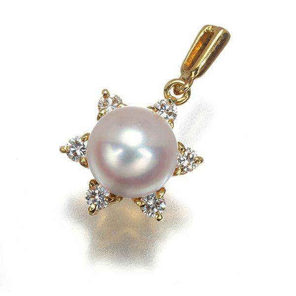 鮮やかなテリと共にピンクの干渉色浮かべるミキモト厳選アコヤ真珠の輝きを6石の上質ダイヤモンドが煌めき包む美しいペンダントトップです。