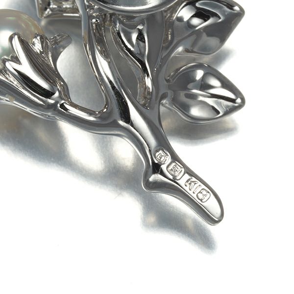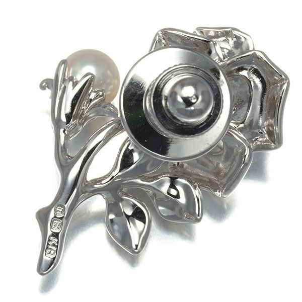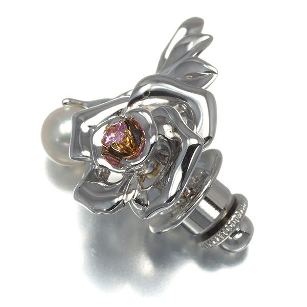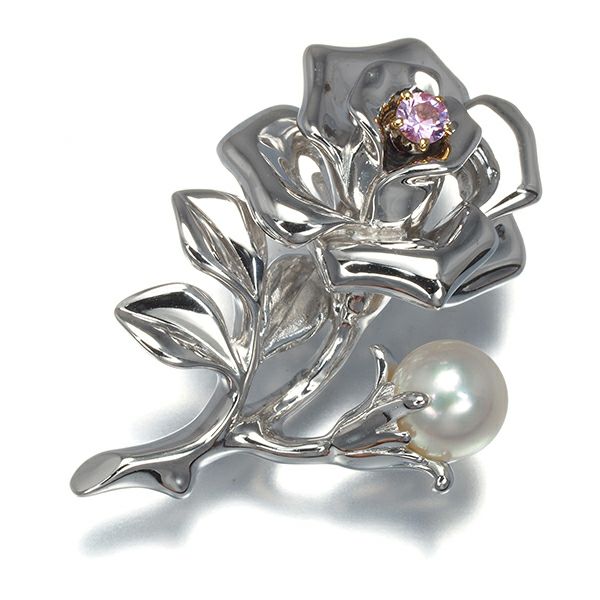 ミキモト厳選のパールを添えた美しい薔薇モチーフのブローチジュエリー。つぼみには18金の爪で留められた可憐なピンクサファイアの煌めきを飾っていますよ。