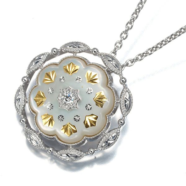 伝統的な技法 ピクウェ を現代に蘇らせた ミキモトの美しい一品。優雅な装飾とシェルの輝きと共に胸元にエレガンスを与えてくれるジュエリーです。